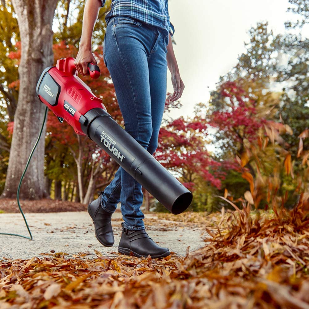 The Hyper Tough 7.5-Amp 450 CFM Turbine Blower is for home or business owners that have a lot of property to clear of leaves and debris. Or it’s for people with smaller spaces that just want to get the job done quickly. With 450 CFM (Cubic Feet per Minute) of air flow blasting out of the turbine, it’s designed to move large piles of leaves or litter. There are 2 Speed settings so you can blow away heavy duty jobs, or slow it down to catch corners, work off hard surfaces or just blow lighter stuff. The 7.5-Amp motor is more than adequate to provide all that airflow, and being electric it’s cleaner, greener and more efficient. The grip and body are ergonomically designed to be comfortable and only require one-hand to operate. And at only 6.6 lbs. you’ll have the energy to carry it around and clean up the whole neighborhood. It’s easy to assemble as with all Hyper Tough tools it’s built to be strong and durable.