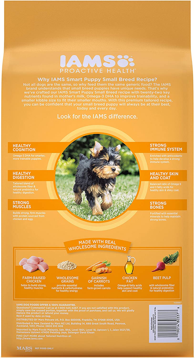 IAMS PROACTIVE HEALTH Small & Toy Breed Smart Puppy Dry Dog Food is veterinarian recommended and made with real ingredients. Our recipe starts with farm raised chicken and includes wholesome grains and veggies. It’s tailored to the little guys—small puppies 20 lb. or less at maturity. Plus, our quality, easily digestible ingredients provide your pup with a strong immune system, healthy skin and coat, and strong bones. Best yet? Omega 3 DHA makes your puppy even smarter. Look for the IAMS difference.
