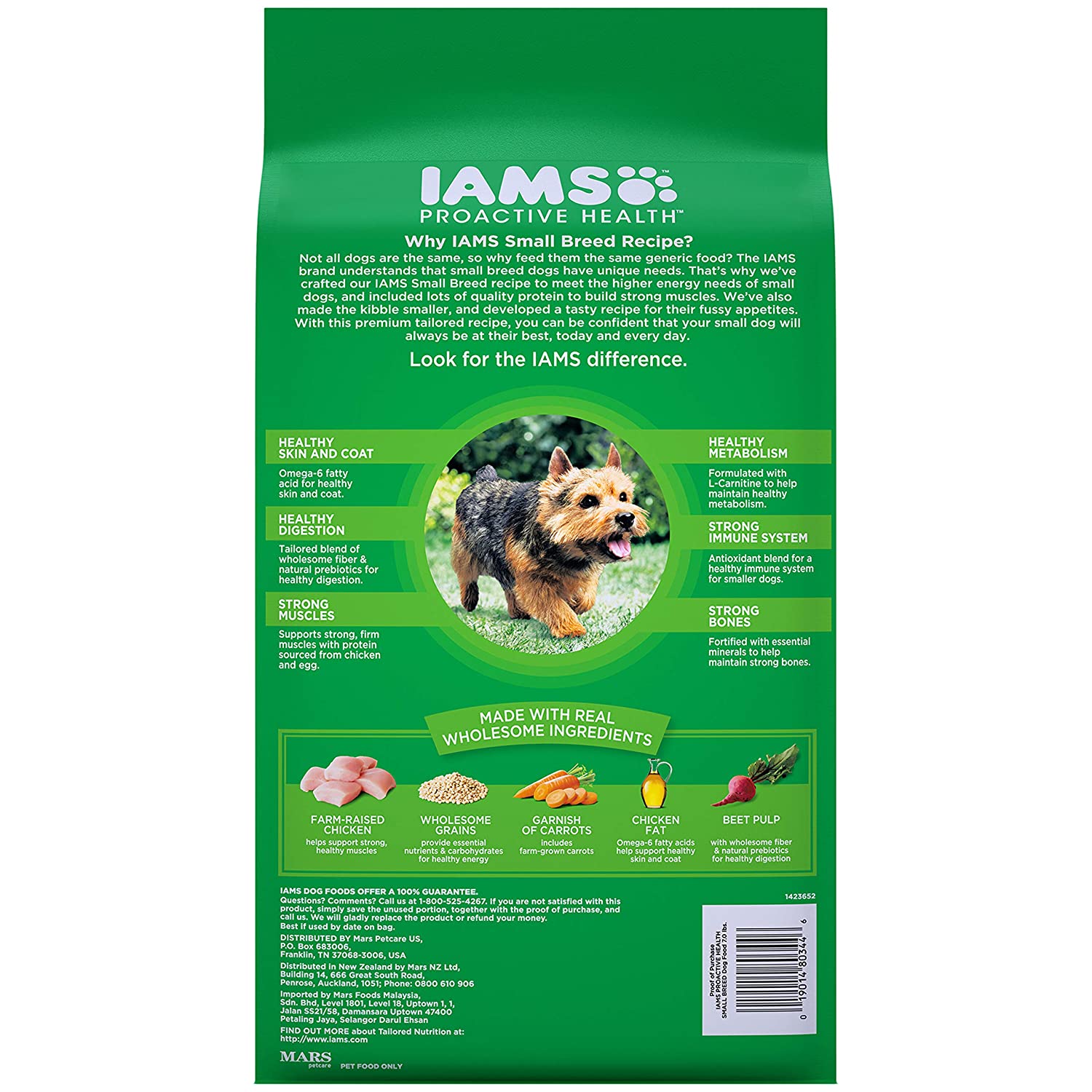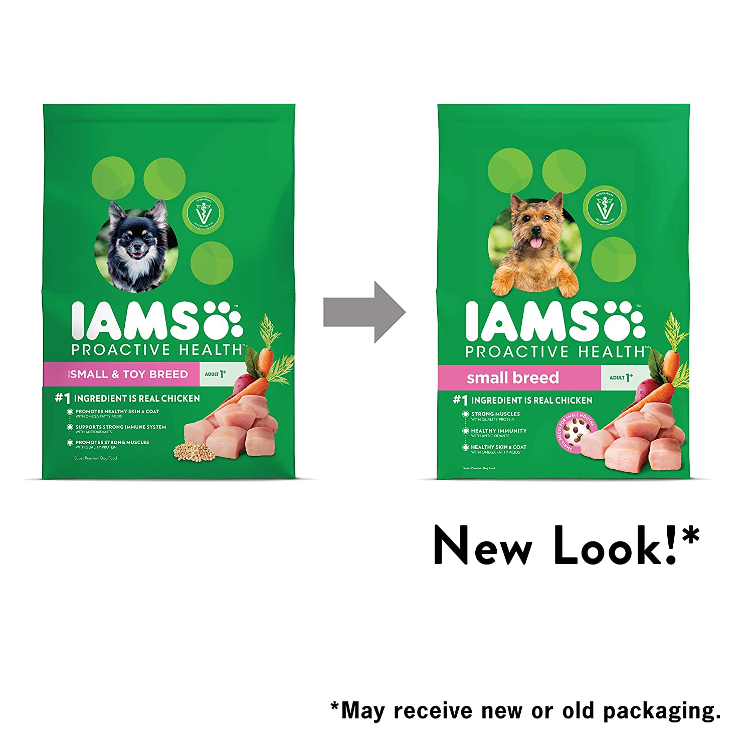 IAMS PROACTIVE HEALTH Small & Toy Breed Adult Dry Dog Food is veterinarian recommended and made with real ingredients. Our recipe starts with farm-raised chicken and includes wholesome grains and veggies. It’s tailored to the little guys—small breed dogs 20 lb. or less. Plus, our quality, easily digestible ingredients provide your dog with a strong immune system, healthy skin and coat, and strong bones. Look for the IAMS difference.