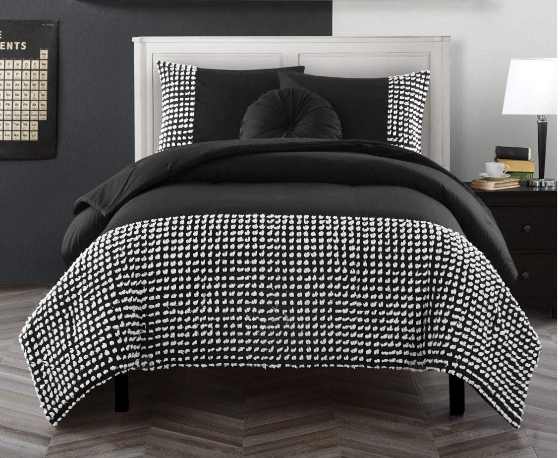 Complete the setting of a fun dorm room or teen room with the Tufted Stripe Comforter Set. Crafted from beautiful poly cotton material with polyester fill, this set is durable and functional. Featuring a solid black comforter with clipped fabric band with a contrast white color, this comforter set creates a unique and elegant atmosphere. The set reverses to solid black with the same color as the front reverse. This comforter set is machine washable (please make sure to see care instructions label) for easy care.
