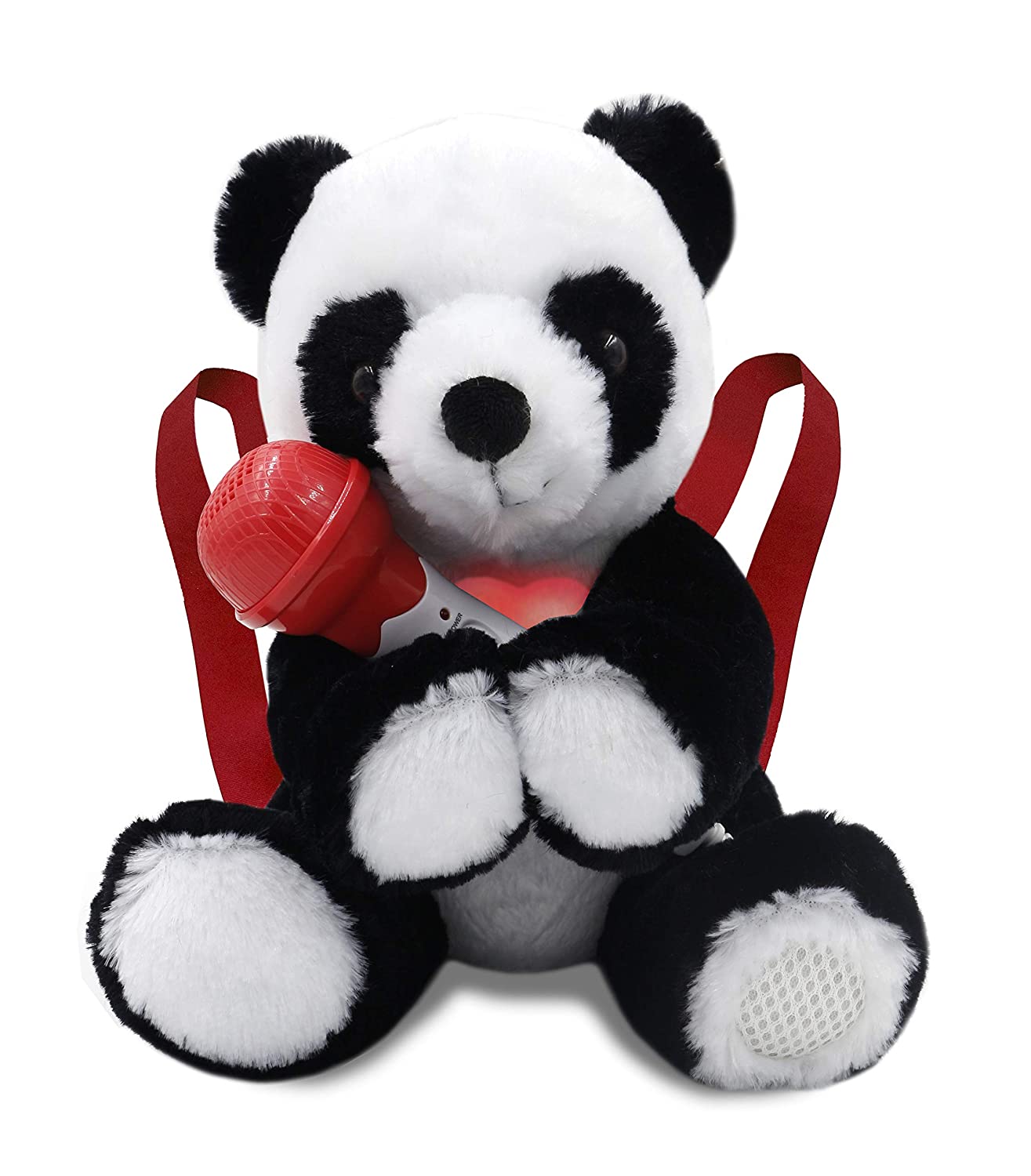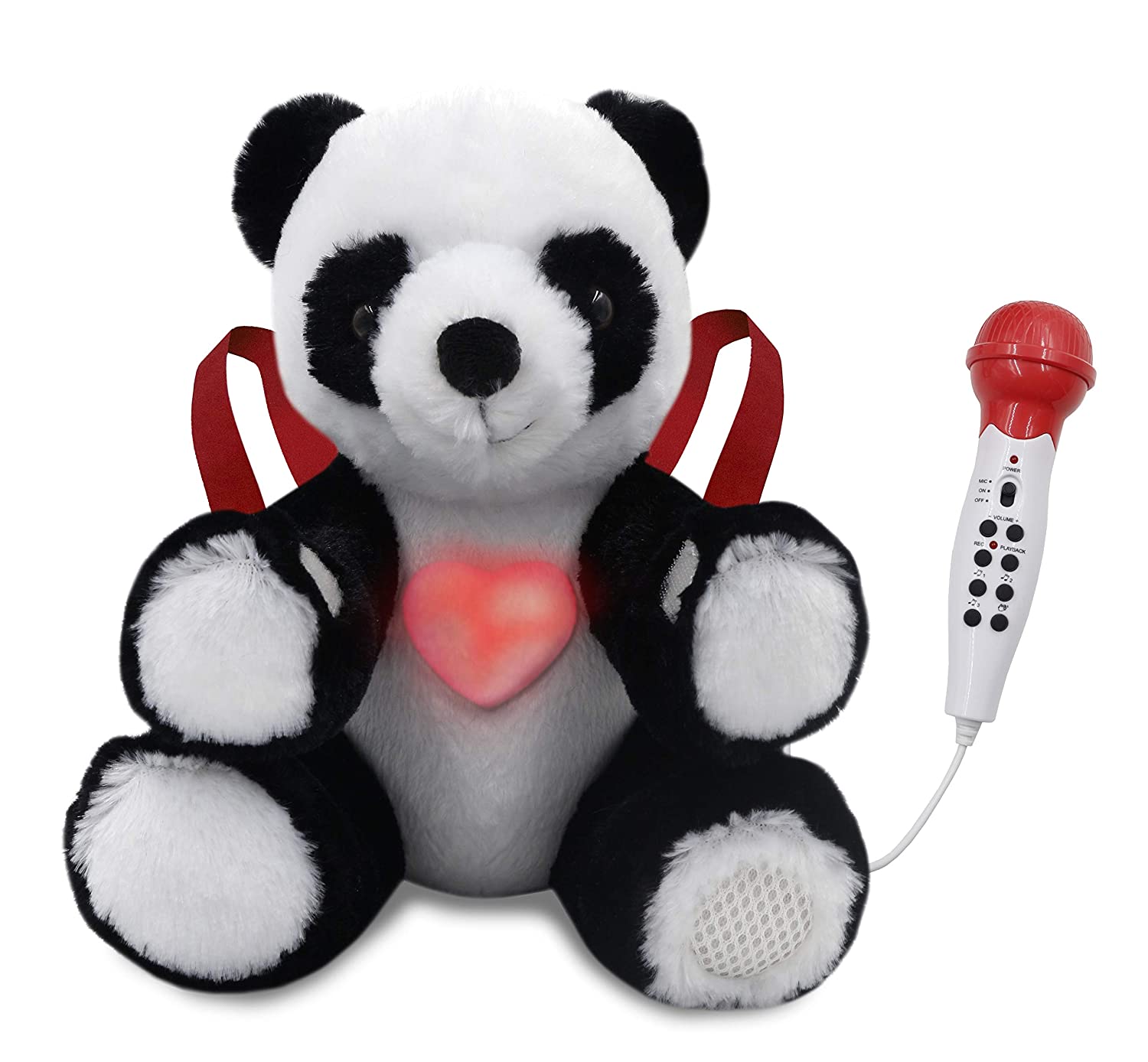 The Plush Panda Singalong Buddies will give your child hours of entertainment. The Singalong Buddies includes a Wired Microphone with 3 Pre Loaded Songs for your child to singalong with, a Record function to Record your child's voice, and an illuminated heart on the chest that lights up. The Plush Panda also includes a shoulder straps that fit comfortably on your child's back, front or off the shoulder. The Singalong Buddies operates on 3 AA Batteries and includes an Auto Shut-Off for safety.