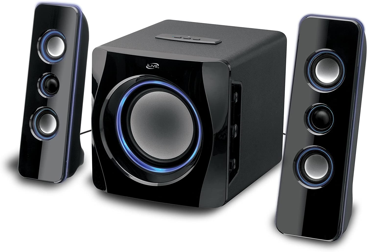 The iLive Portable Wireless Speaker System with Built-In Subwoofer is the perfect accessory for any room. Stream your music with Bluetooth, connect a TV, DVD player, video game system, MP3 player, or computer and be blown away by the magnificent sound. With LED light effects, this 3 speaker system features a durable wooden enclosure and built-in AC power cable. The stereo speakers are detachable so you have more flexibility with placement on your desktop, shelf or counter area. Includes 3.5mm to RCA audio cable. Black. iLive products are specifically designed to enhance your digital devices including iPod, iPhone, iPad, Android, Blackberry, Mobile Phones, Tablets, Televisions, and Bluetooth devices. Our focus is on delivering a great product that serves as an extension of these devices, in both design and function, without compromising on audio quality, feature-set, or ease-of-use.
