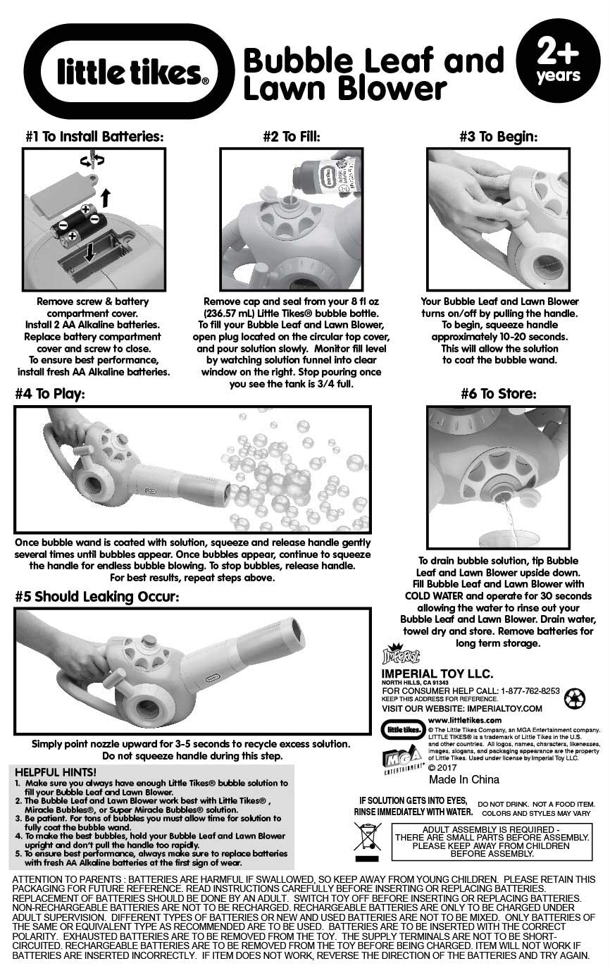 Chosen as one of the Best Toys of 2011 by Good Housekeeping Magazine and nominated for a TOTY Outdoor Toy of the Year Award for 2012, the Imperial Little Tikes Garden Leaf and Lawn Bubble Blower blows tons of bubbles with a simple squeeze of the trigger. A realistic design just like dad’s leaf blower is complemented by revving sounds and a side window that shows the Super Miracle Bubble solution inside and when it's time for a bubble refill. . The Garden Leaf and Lawn Bubble Blower supplies endless hours of outdoor fun, and helps teach kids the value of grown up chores, to appreciate nature, improve motor skills and build confidence.