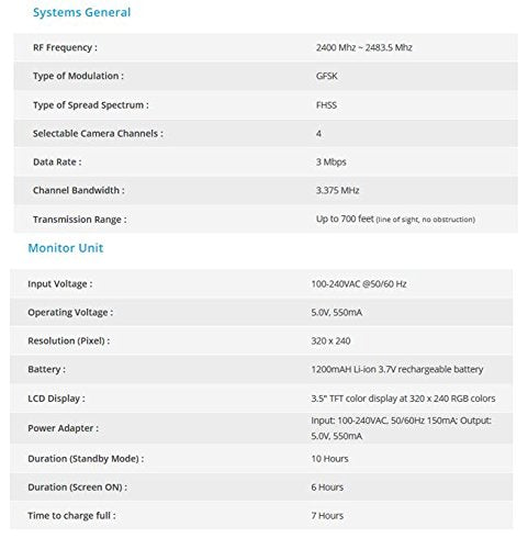 RF Frequency: 2400 Mhz ~ 2483.5 Mhz Transmission Range: Up to 700 feet (line of sight, no obstruction). Channel Bandwidth - 3.375 MHz