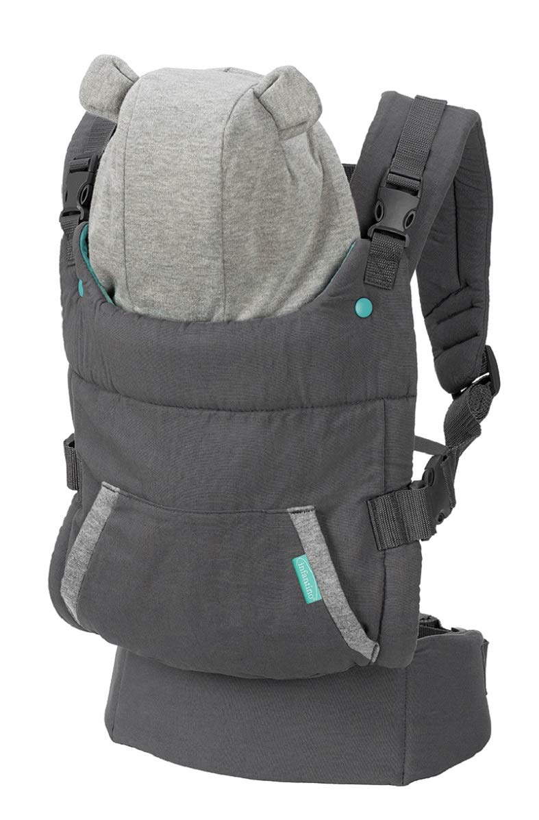 Infantino Cuddle Up Ergonomic Hooded Carrier Adjustable: Yes Color: Grey Weight Limit: 12-40 lbs Closure type: Full-buckle closure Materials: Cotton and polyester Dimensions: (HxWxD) 18 x 14 x 1 Inches Weight: 1lbs Care and Cleaning: Machine Wash Warning: Failure to follow the manufacturer’s instructions can result in death or serious injury. Read all instructions before assembling and using your carrier. Keep instructions and review them before attempt- ing new carrying positions. Carrier is not meant to be used for baby facing out. Always keep one hand on baby while adjusting carrier. Never use when balance or mobility is impaired. Fall and Suffocation Hazard Fall Hazard: Infants can fall through wide leg opening or out of carrier. Adjust leg openings to fit babies legs snugly Before each use, make sure all knots and fasteners are secure Never bend at waist, bend at knees Only use carrier for babies between 12 lbs and 40 lbs Suffocation Hazard: Infants under 4 months can suffocate in this product if face is pressed tight against your body. Do not strap infant too tight against your body Allow room for head movement Keep infant’s face free from obstructions at all times Care Instructions: Machine wash cold, separately, on gentle cycle with mild detergent. Do not bleach. Wipe clean with cloth or sponge between machine washings. Drip dry only. Do not iron.