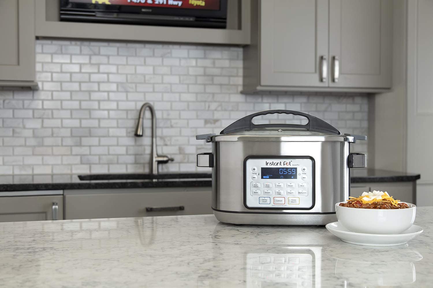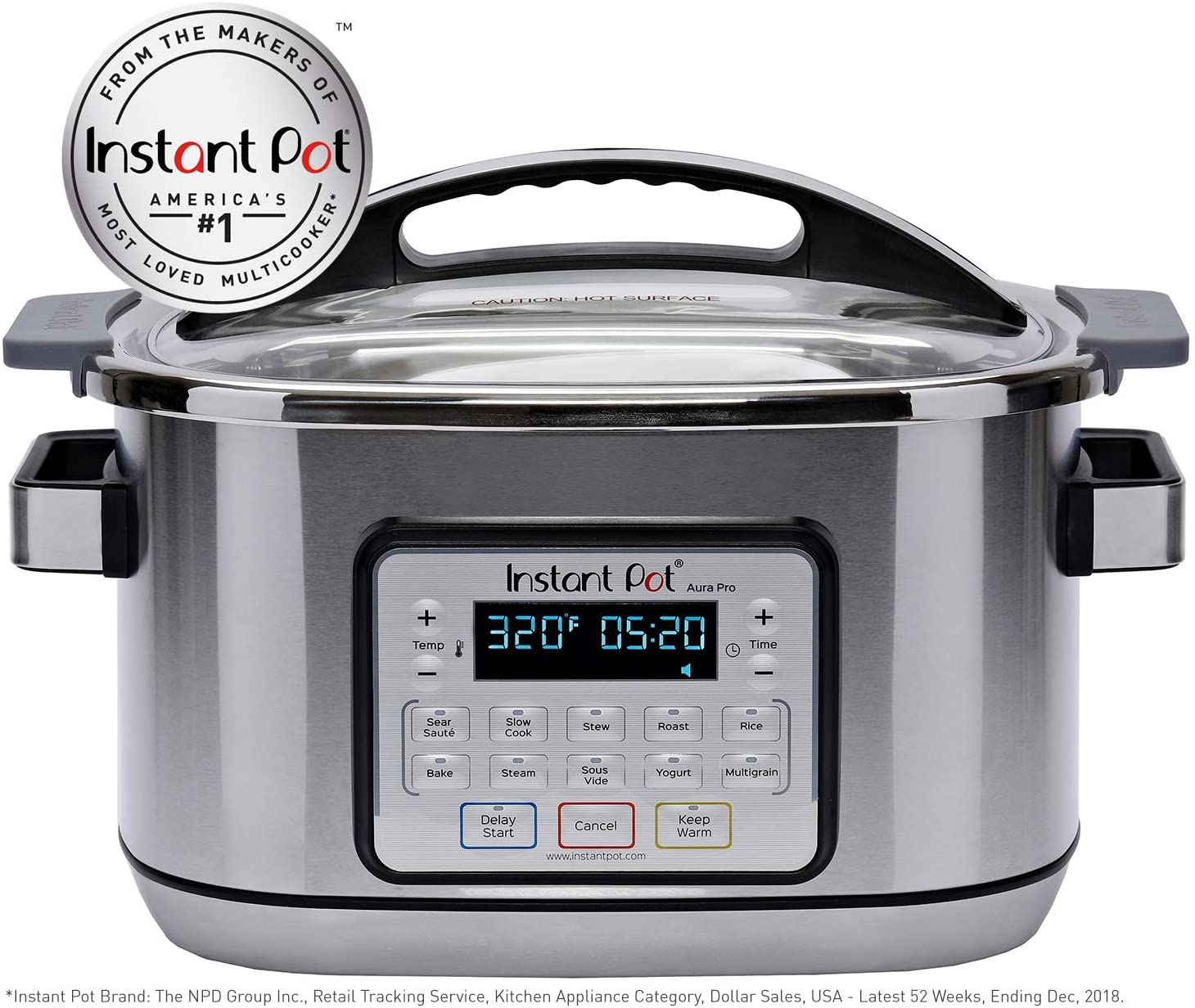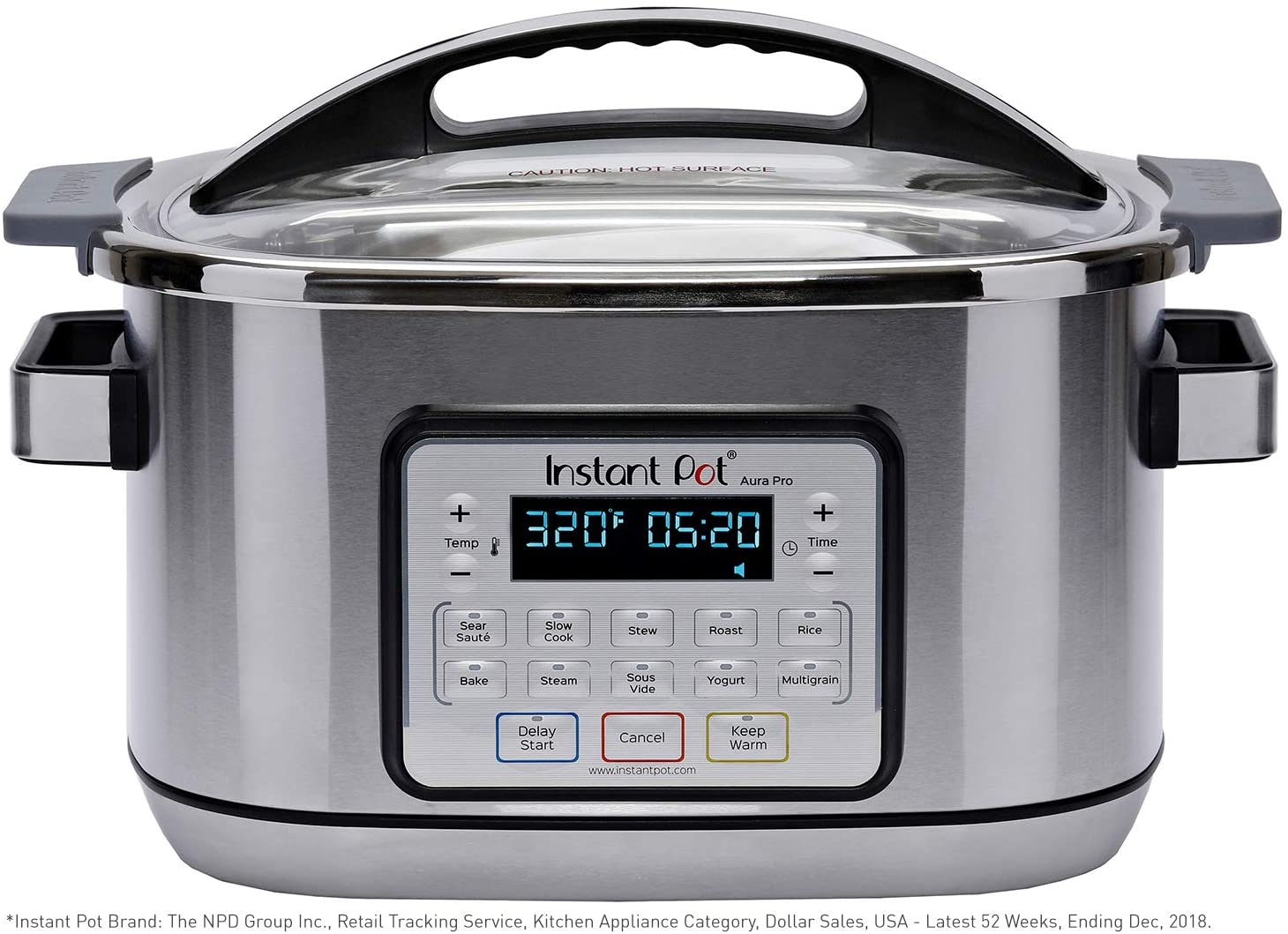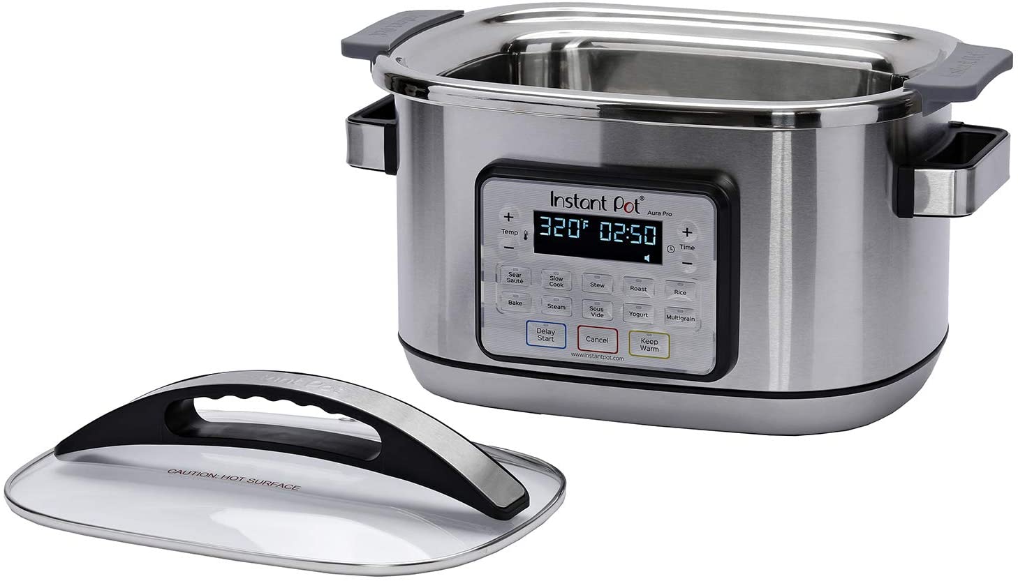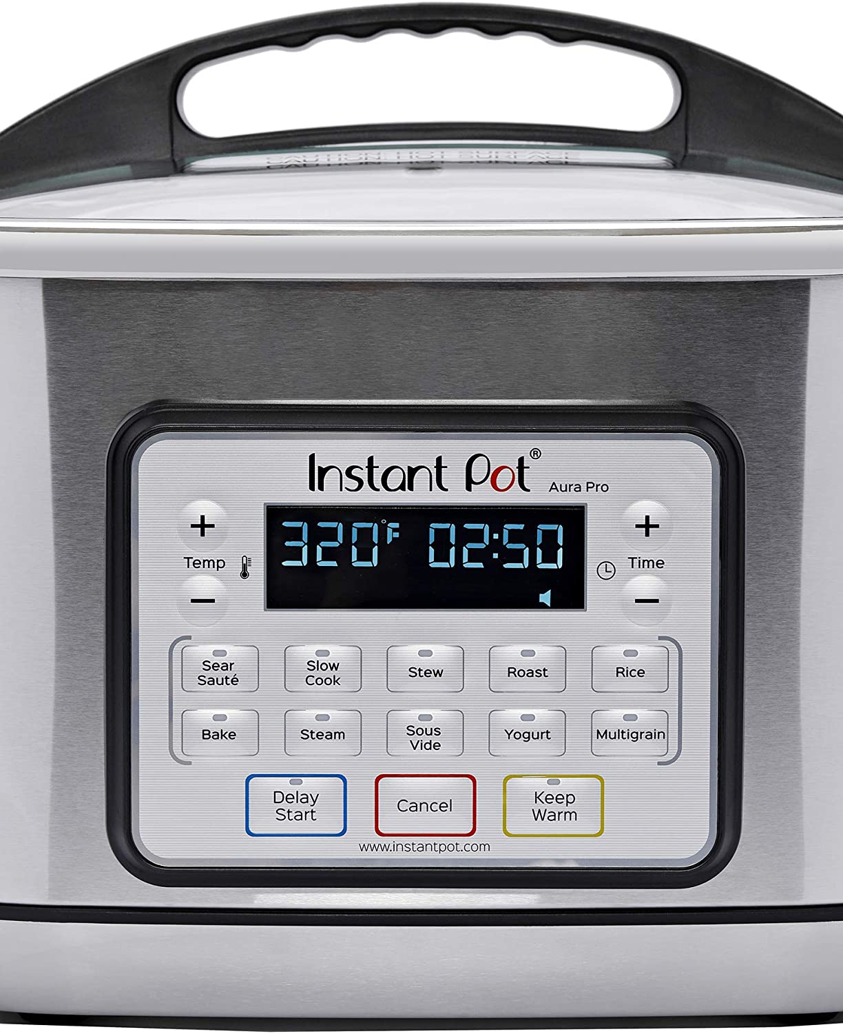 Instant Pot Aura Pro 11-in-1 Multi-Use Programmable Multicooker with Advanced Microprocessor technology, incorporates the same technology behind North America’s number #1 selling Instant Pot Pressure Cooker. The Aura Pro replaces 11 commonly used appliances. With the Pro, you can - Sear/Sauté, Bake, Slow Cook, Steam, Stew, Sous Vide, Roast, Yogurt, Rice, Multigrain and Keep Warm, all in one cooker. With 11 Smart Programs your favorite dishes can now be prepared to perfection by simply pushing a button. The interior cooking pot is Food Grade Stainless Steel 304 (18/8) with an aluminum exterior for enhanced cooking performance. And, the cooking pot, the lid and the collapsible steam/roasting/sous vide rack are all dishwasher safe – yet another way in which Instant Pot makes cooking and cleanup extremely easy for you. Power – 1500 watts