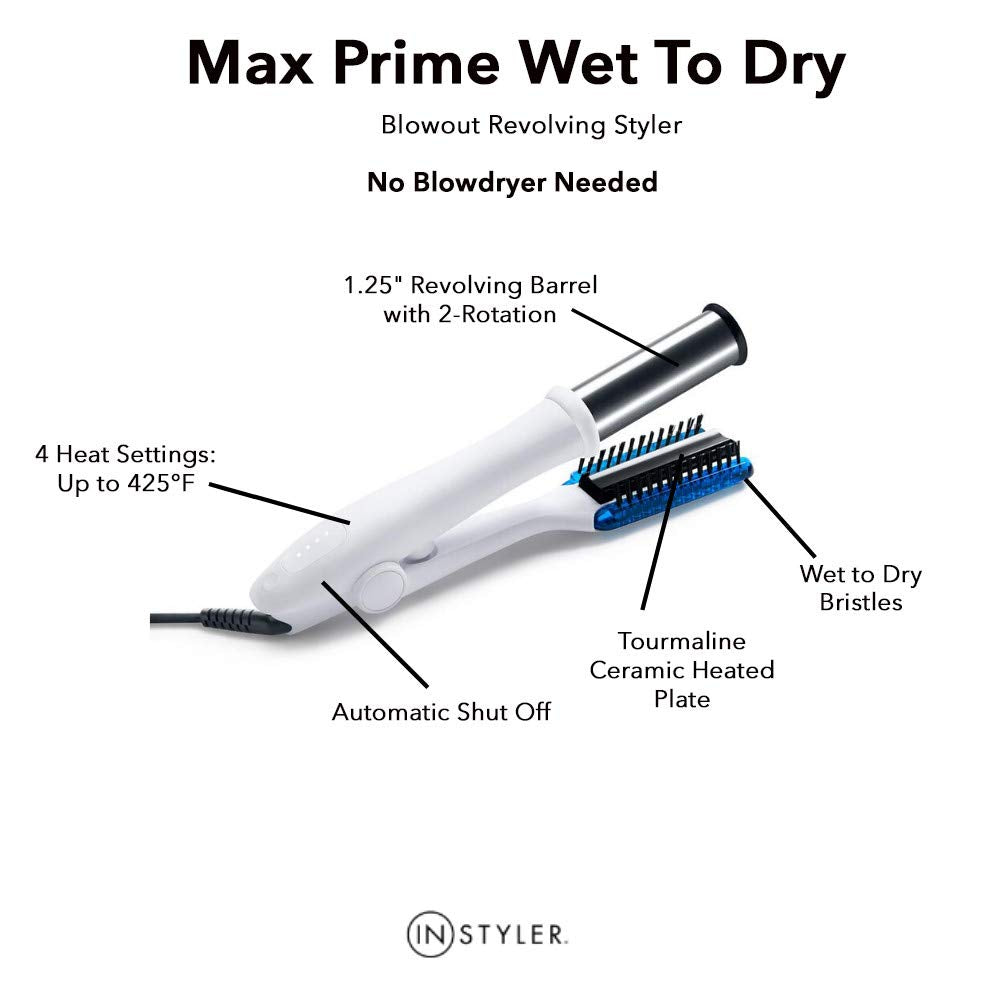 From the manufacturer Features: Why InStyler? All of the products in the InStyler family are a result of tireless innovation, high tech engineering, and true passion. Whether you’re 'long hair, don’t care' or the perfectly polished type, InStyler has got you and your hair goals covered. Max Prime Wet To Dry Maximum Performance No blowout bar needed. The patented Max Prime Wet To Dry Blowout Revolving Styler is the only Revolving Styler that dries and styles all at once. Max Prime Wet To Dry harnesses the styling power of a round brush and blow dryer to produce smooth, shiny hair with volume and movement. Innovative Technology Spinning at over 100 revolutions per minute, the heated revolving barrel delivers maximum drying and straightening power as it simply glides down the hair. The rounded design of the barrel and tourmaline ceramic heated plate prevents creasing or crushing that can flatten hair, while the ionic bristles polish strands to reduce frizz and deliver ultimate shine. Smooth and Straight Towel dry your hair to absorb as much moisture as possible. Max Prime Wet To Dry styler will perfectly smooth and polish hair for a straight and sleek style without crushing or creasing the hair. To straighten, close the Max Prime Wet To Dry around a section of hair and glide slowly from root to ends. Soft Curls and Beachy Waves For soft curls and beachy waves, wrap a section of hair around the barrel from root to ends and close Max Prime Wet To Dry around the hair section. Let the rotating barrel do all the work for you. Make sure to hold Max Prime Wet To Dry in place while closed around the hair section and do not pull through the hair. Let the barrel rotate for 3 to 5 seconds before opening the barrel to release hair, letting the curl gently drop off the barrel. Volume and Lift To give hair an extra lift at the roots, close Max Prime Wet To Dry around a section of hair at the scalp and let the barrel rotate from root to tips for 3 to 5 seconds before gliding down through to the ends of your hair. For added volume, rotate the barrel in the opposite direction from tip to root to create a backcombing effect. NO BLOWDRYER NEEDED The only wet-to-dry styler that utilizes patented rotating technology to straighten, add curls, and waves, while simultaneously drying hair. Skip the blow drying and easily get that coveted blowout look. MAX PRIME WET TO DRY dries by whisking water out of towel-dried hair and safely venting it away. The innovative 2-way rotating technology ensures easy styling in the natural direction of the hair, maximizing the smoothing and polishing performance to deliver a super soft and shiny finish. FASTER, HEALTHIER STYLING Our innovative technology uses constant motion to perfectly style without crushing the hair between two scorching hot plates. With 360° of straightening power, MAX PRIME WET TO DRY allows you to style faster and exposes your hair to less damaging heat. The tourmaline ceramic heated plate allows MAX PRIME WET TO DRY to maintain a consistent heat up to 425°F for maximum speed and styling efficiency. FRIZZ-FREE FINISH Innovative wet-to-dry ionic bristles emit ions to reduce frizz and deliver maximum shine. The rounded design of the barrel prevents crushing and creasing, resulting in salon-worthy, healthy hair with volume. STYLING VERSATILITY The revolutionary design of the 1.25” two-way rotating barrel dries and straightens hair and gives you the option to easily add curl, body, and shine to damp or dry hair. Style starts at the root; glide over roots to straighten and smooth, even start rotation at the base and lift to enhance volume. Effortlessly add those voluminous curves by directing MAX PRIME WET TO DRY away from your face. Go one step further and wrap strands around the barrel to create curls and beachy waves that last for days. Use on all hair types: long, short, thinning, thick, coarse, curly, straight, and frizzy. For best results, use on towel dried hair.