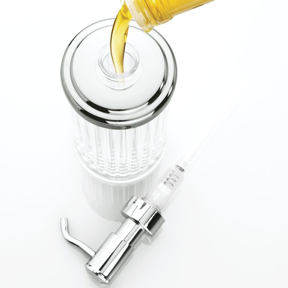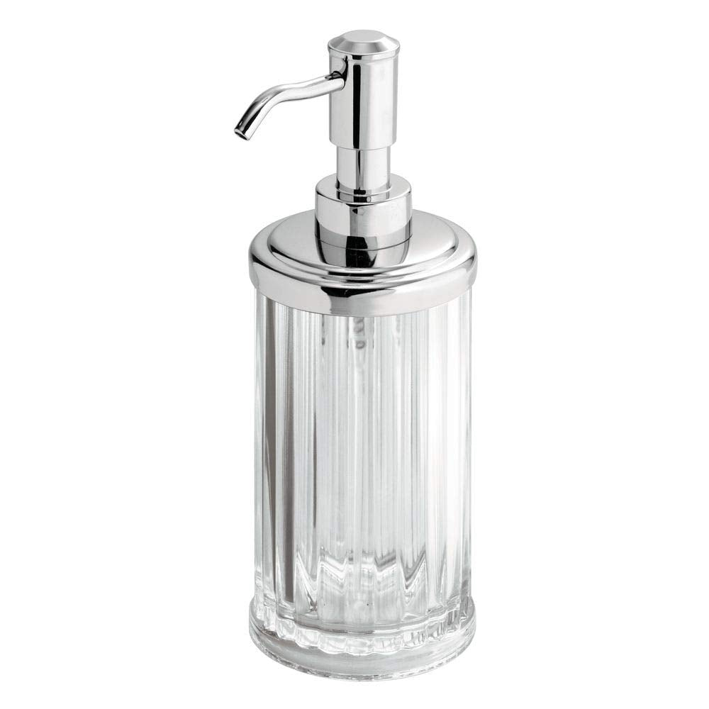 The iDesign Alston Soap Pump is a modern and practical accent for your kitchen or bathroom sink. This pump features a stainless steel pump head with a chrome finish that will continue to look good as new through years of quality use. The body is made of durable clear plastic with a ribbed texture for an elegant touch that will make a great addition to any decor. It can hold up to 13 oz. of your favorite liquid soap or lotion for your convenience. This rectangular plastic soap pump is sleek with a wide opening, making refilling the soap easy! The study base will prevent the soap dispenser from sliding around or being knocked over. The iDesign Alston Soap Pump measures 3.5" x 3.5" x 8", the perfect size for your vanity or counter space. With iDesign by InterDesign, you can #LiveSimply every day.