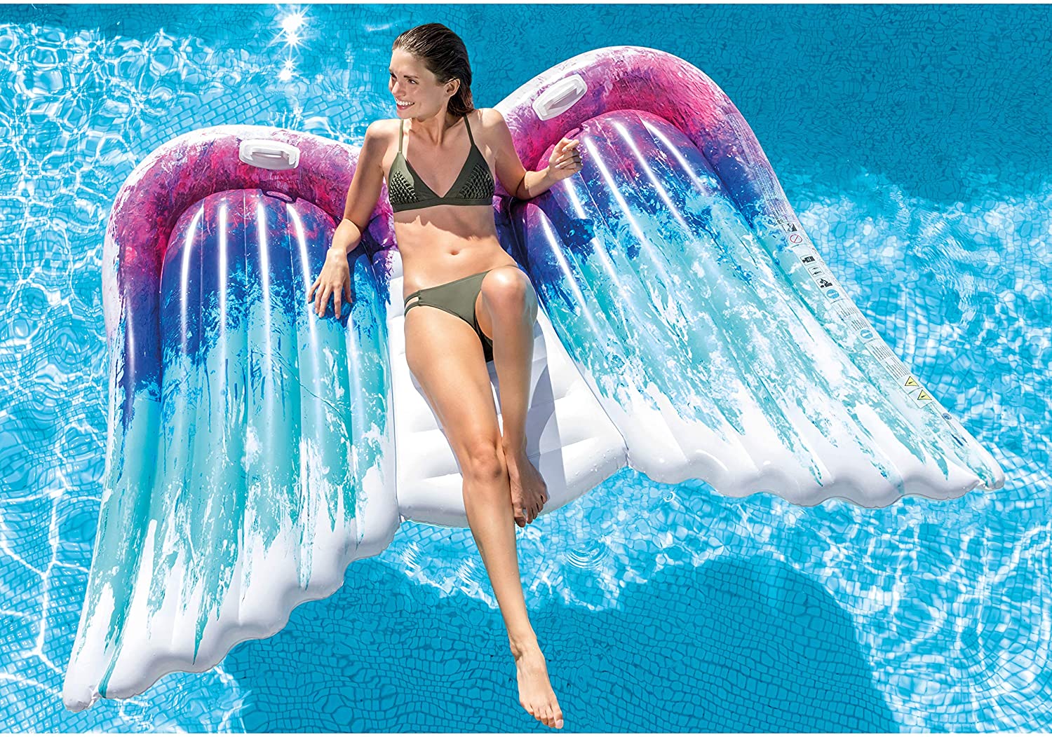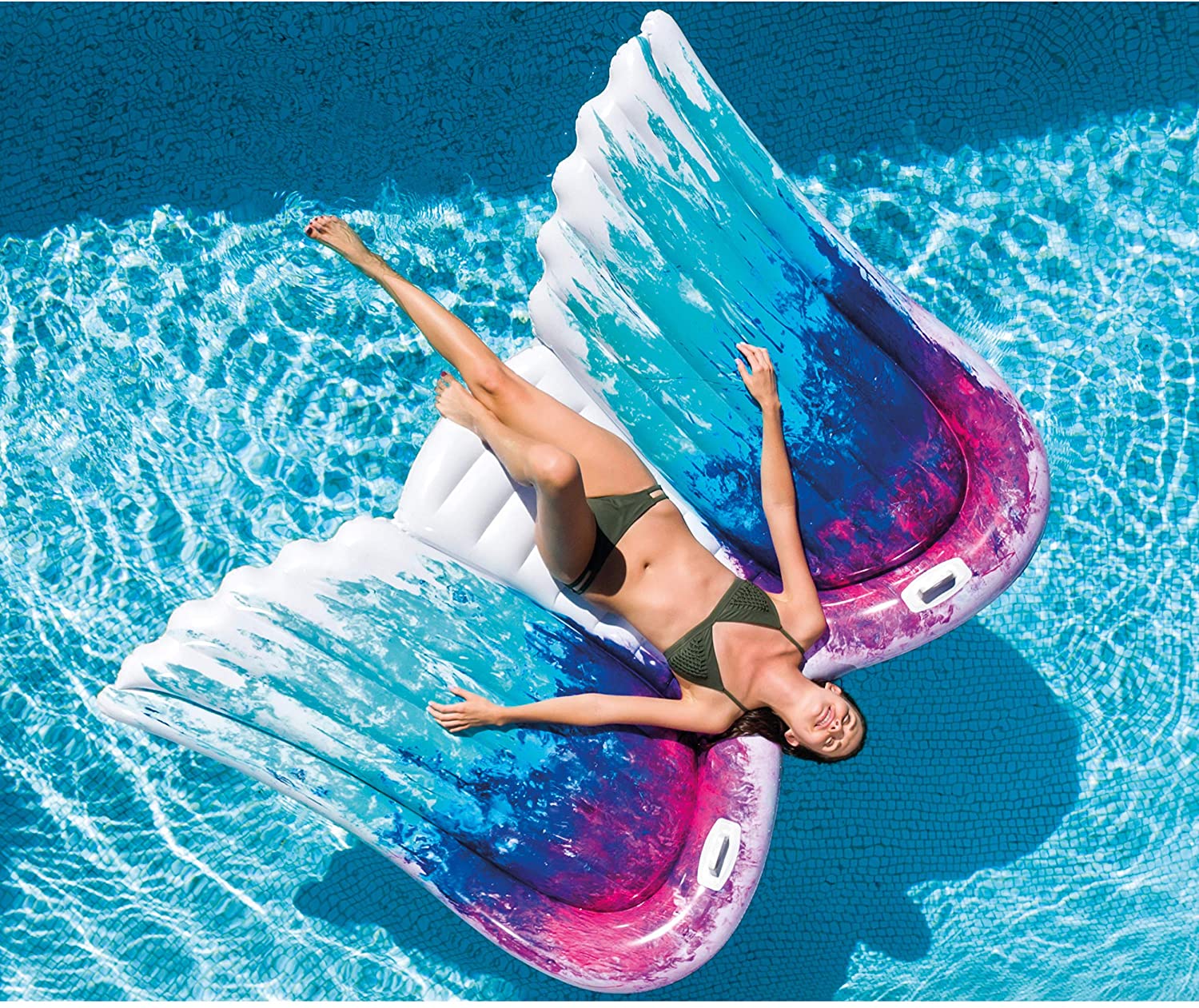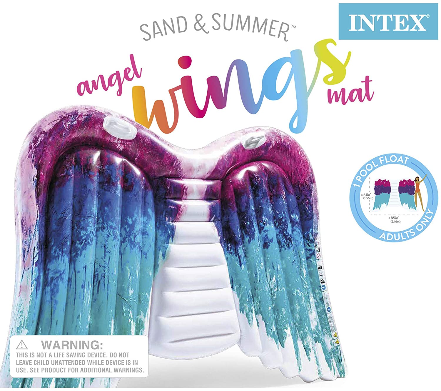 Spread your wings at your next pool party with this gorgeous Intex angel wings float.   this float provides over 7' Of relaxation. This oversized float is perfect for relaxing alone or with some friends.   it is part of the global angel wings project which is seen throughout many countries. The Intex angel wings float features colorful graphics and heavy duty handles.     It is part of the global angel wings project which is seen throughout many countries.