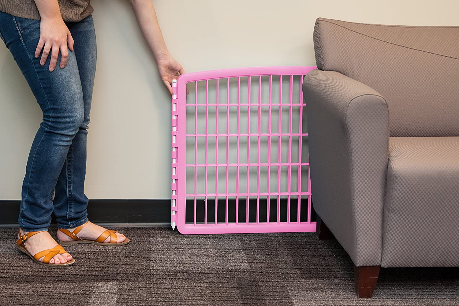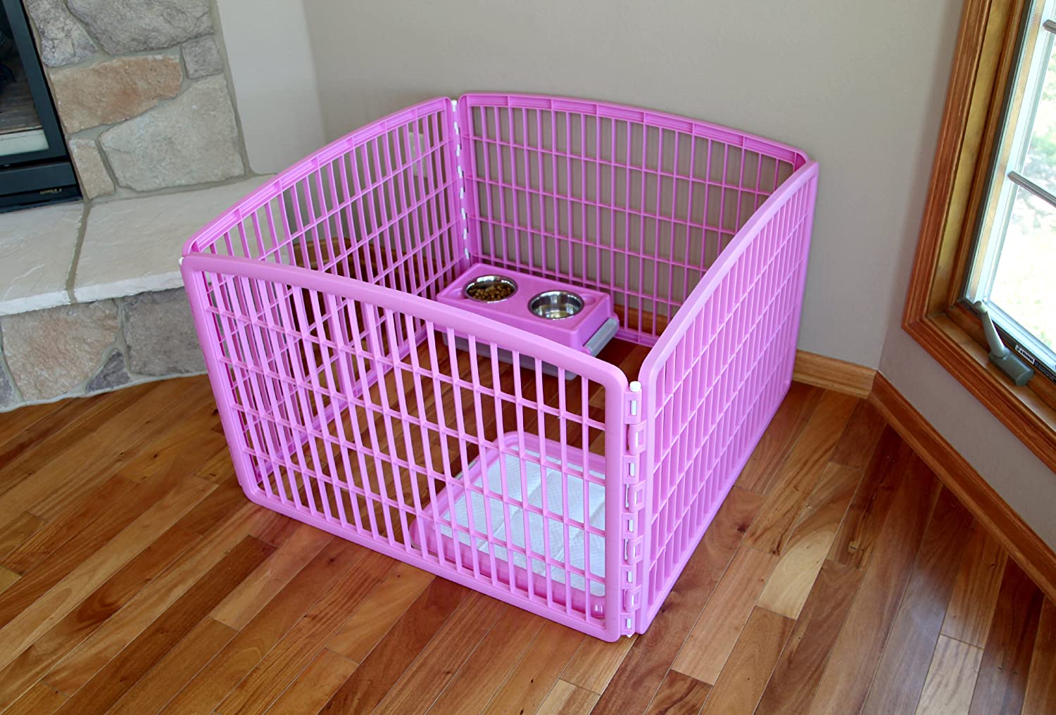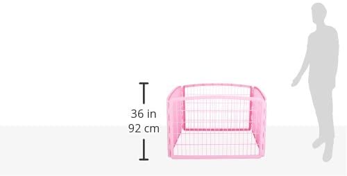 IRIS 24'' Exercise 4-Panel Pet Playpen without Door, is perfect for puppies, small to large dogs, and other family pets. The IRIS Exercise Pet Playpen can be utilized indoors or outdoors; the pet playpen is portable and provides 8 square feet of exercise space for pets! Each panel measures 33.6"W x 24"H; door measurements 14.5''W x 16.5''H; the distance between bars is 1.5''. The IRIS Playpen is made of durable, heavy-duty molded plastic, the playpen will last for years and will never rust! The panels interlock securely with full-length connecting rods, and the pens can be positioned in different shapes to suit your pet's needs best. Each panel features a non-skid rubber foot to protect flooring. To create a more spacious exercise pet playpen, add IRIS 24'' Exercise 4-Panel Pet Playpen Panel Add-On, Pink, ASIN: B008V5QKJG and IRIS 24'' Exercise 4-Panel Pet Playpen Roof, White, ASIN: B006UJGFZY to keep pets safe and secure!