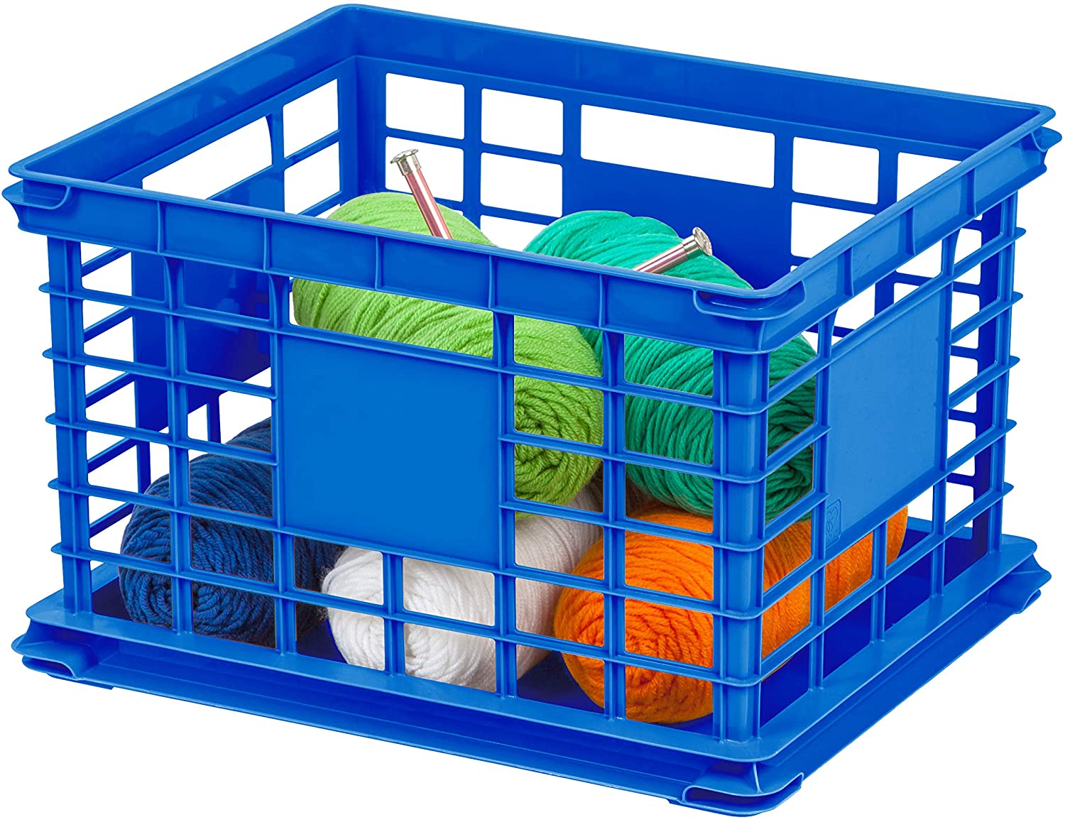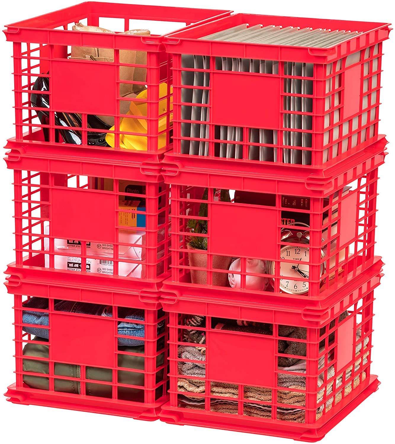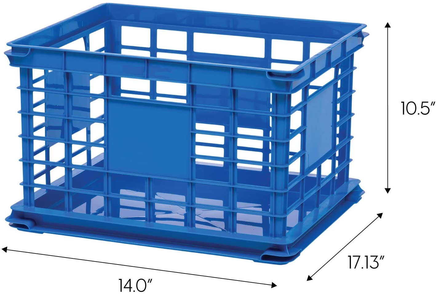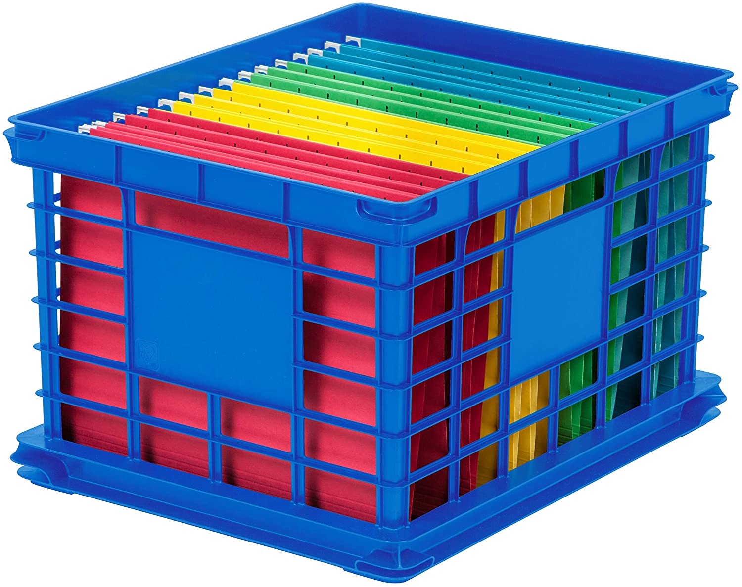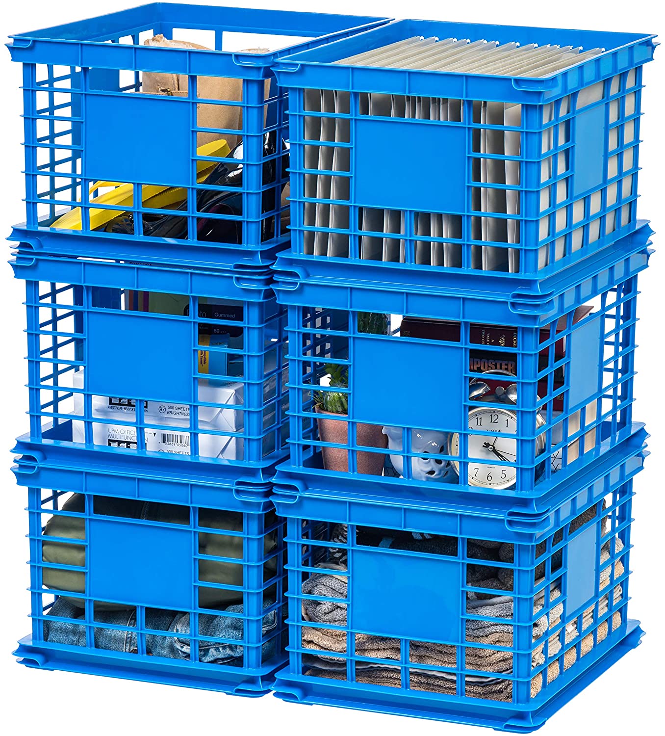 Lightweight stacking crate is ideal for storing and transporting letter or legal size hanging files around the office or home. Stack more than one crate to make an easy storage solution not only for office supplies but also for linens, food and books in the dorm room or home. The durability of hanging file folder crate allows for stacking on any of its sides to customize your storage in the office, dorm room, laundry room, garage, or closet. Set of six. Made in the USA.