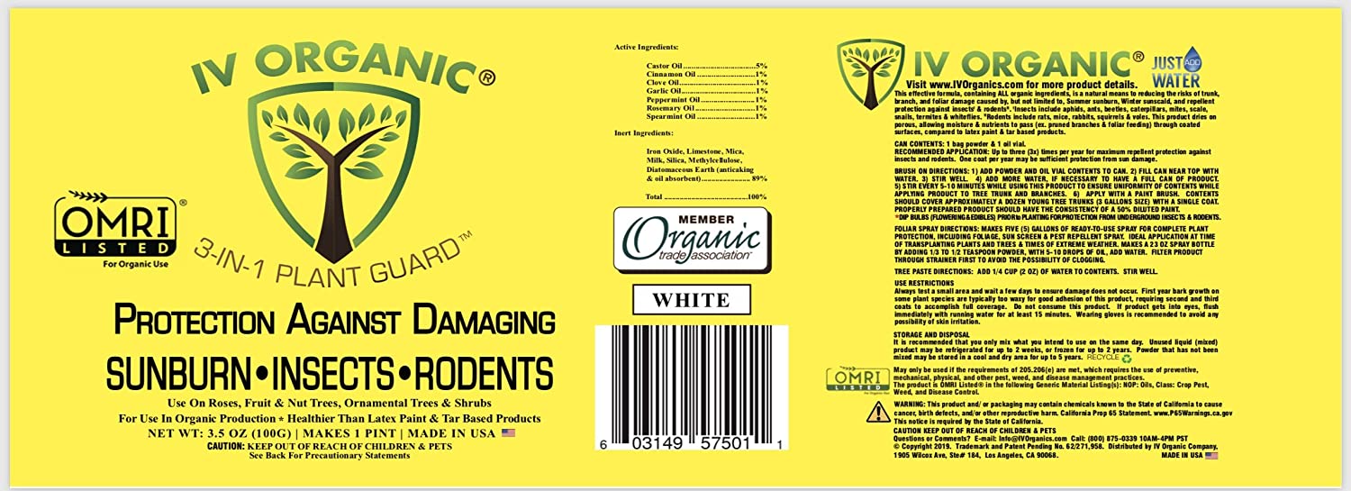 IV Organic 3-in-1 Plant Guard for use on Roses, Fruit & Nut Trees, Ornamental Trees & Shrubs. For Use in Organic Production & Healthier Than Latex Paint & Tar Based Products. Effectively protects plants from damaging Summer Sunburn, Winter Sunscald, Repelling Insects & Repelling Rodents. Protect newly installed plants & trees; as well as maximize the longevity of your established landscape.