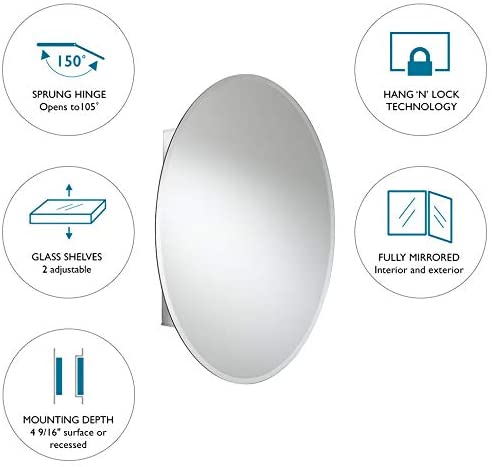 Jacuzzi® PD43000 Key Data: 21" W x 4-1/2" D x 31" H Oval medicine cabinet with mirrored front Two adjustable toughened glass shelves Jacuzzi® PD43000 Features: Surface or recessed mounting Fully mirrored interior Optional mirrored glass side panels included for surface mounting Hinge opens to 165 degrees Constructed from aluminum Covered under Jacuzzi's 1 year limited warranty Jacuzzi® Technologies: Hang 'N' Lock: Featuring a patented system, the bracket is fixed to the wall rather than the cabinet itself; perfected with the aid of a built-in spirit level. This ends the need to support your product in one arm, whilst attempting to accurately measure and mark distances, and screw holes with the other. Jacuzzi® PD43000 Specifications: Width: 21" (from left to right) Height: 31" (from bottom to top) Depth: 4-1/2" (from back to front) Number of Doors: 1 Number of Shelves: 2 About Jacuzzi: Jacuzzi® changed the way people bathed with their invention of the whirlpool tub. With over 60 years in business, Jacuzzi® manufactures all of its bathtubs and shower products here in the United States. For the leading manufacturer of whirlpool and spa bathtubs, Jacuzzi's bathtubs recreate a relaxing experience due to its array of features from illumination to massage jets.