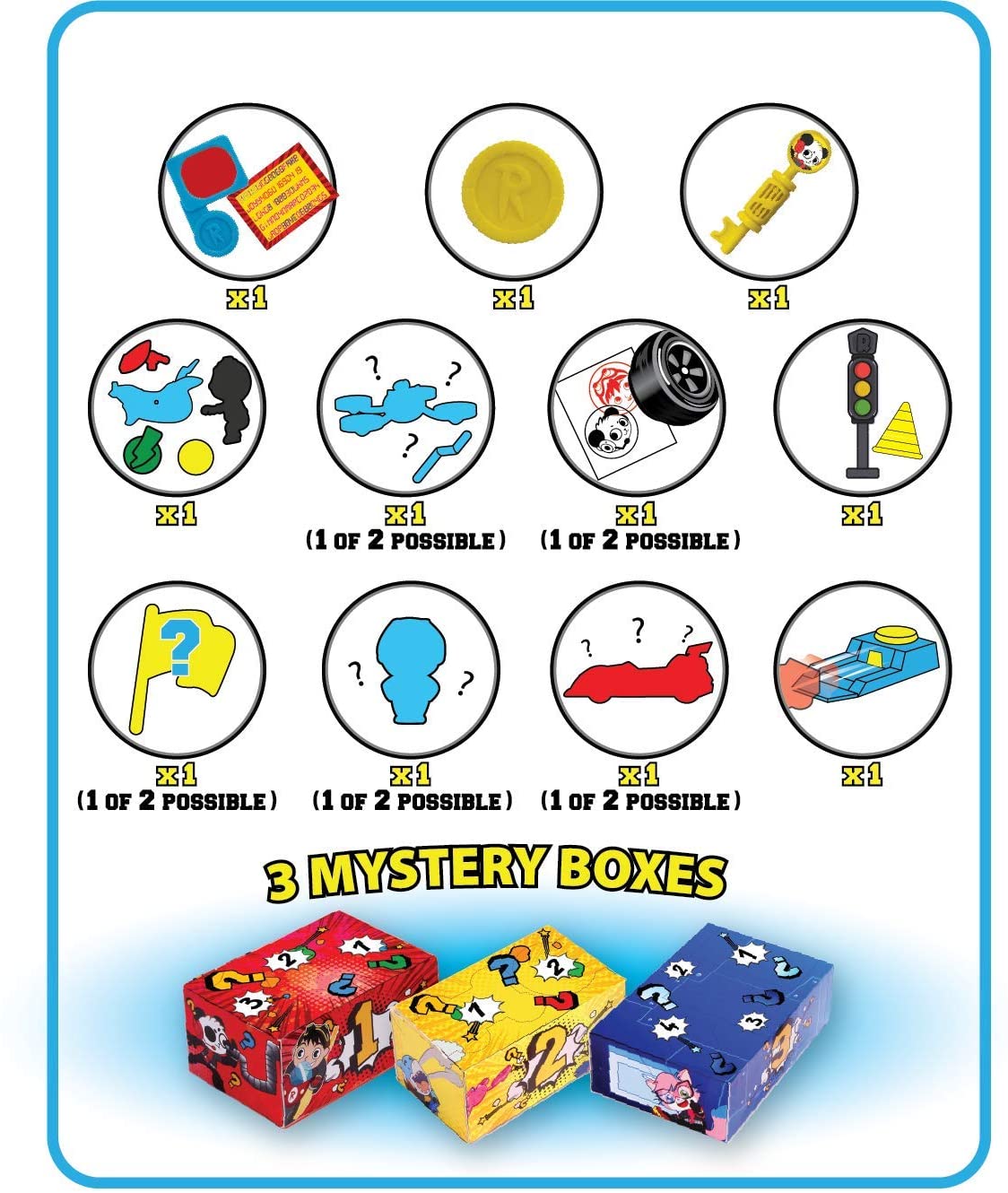 • Comes with 3 decorated Ryan’s World mystery boxes full of surprises. Use the coin and tools to unlock each mystery box