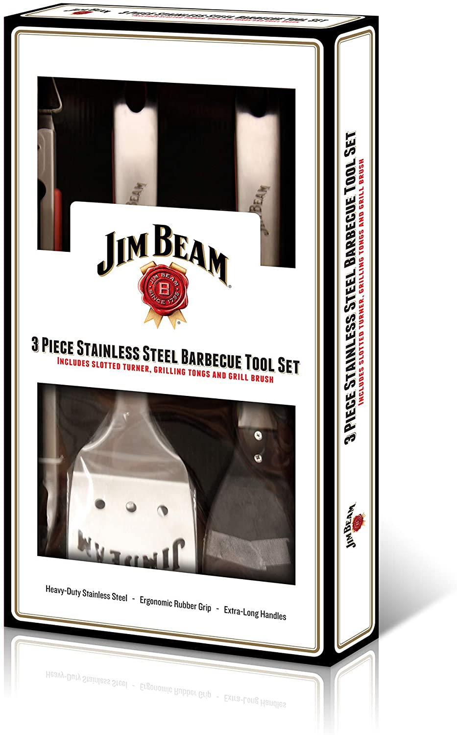 Grill like a pro with the Jim Beam 3 Piece Stainless Steel Barbecue Tool Set. This attractive three piece set features a durable stainless steel construction, extra long handles and built-in hanging loops for easy grill-side access. Each tool features rubber gripped handles for both performance and comfort. The grill brush features a dual purpose brush/scraper with beveled bar edge to help you keep your barbecue in top shape year round.