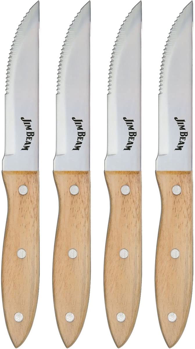 Smooth cutting is possible only if you have a proper grip on your knife. Introducing the all new Serrated Steak knife set from Jim Beam. A perfect slicing tool for all grill enthusiasts. The knives come with serrated blades, triple riveted strength and contour wood grip handles. Bring home Jim beam’s 4 Piece Serrated Knife Set. A simple, versatile kitchen tool for easy and smooth cutting and slicing. Lightweight, ergonomically designed and stamped with the authentic Jim Beam logo.