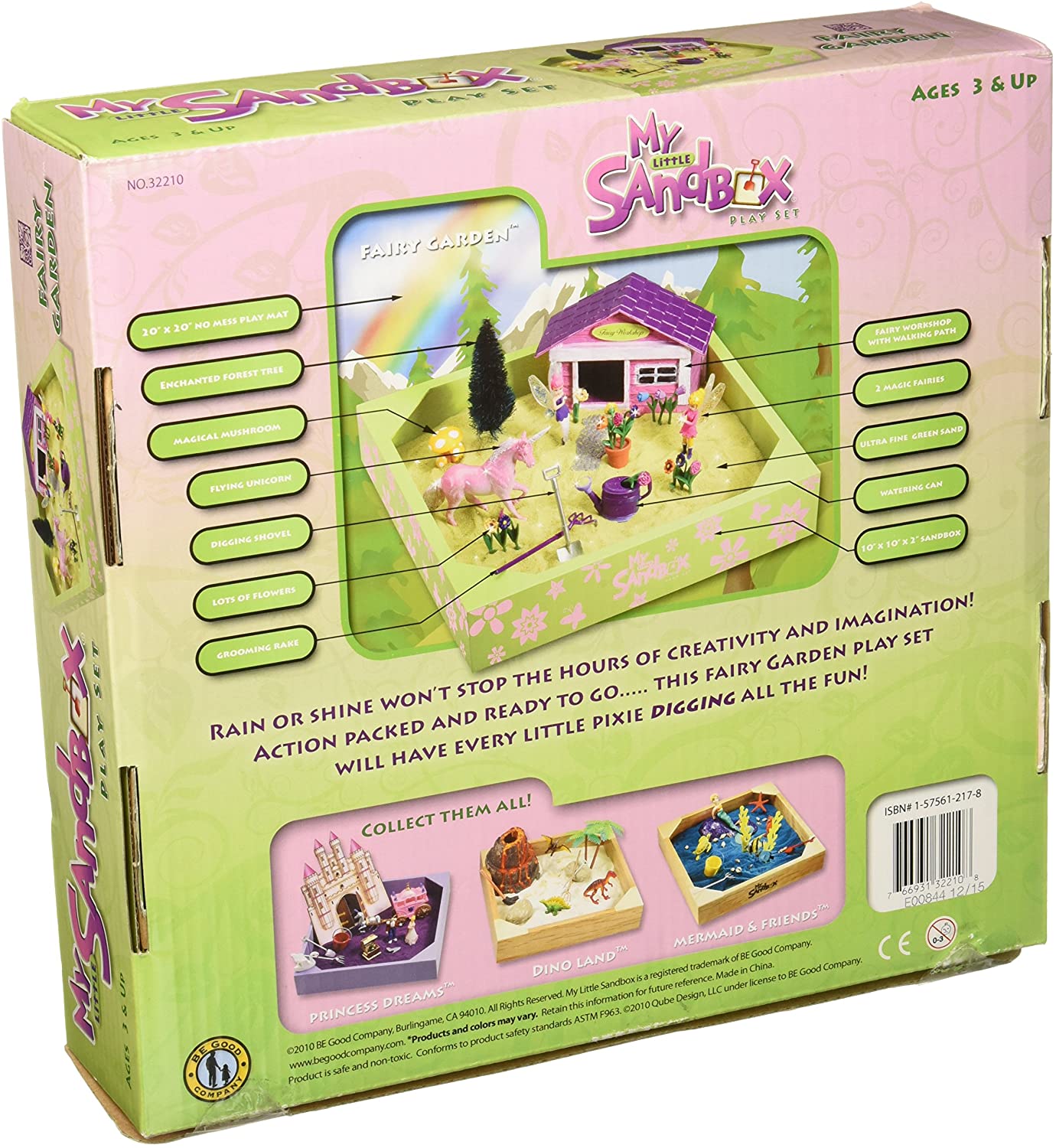 • Set includes 10 10 x2-inch sandbox, 20 20 inch no mess play mat, ultra fine sand, Magic Fairies, Fairy Workshop with Walking Path, Flying Unicorn, Swan on Swan Lake, Colorful Mushrooms, Grooming Rake, Digging Shovel and Water Can