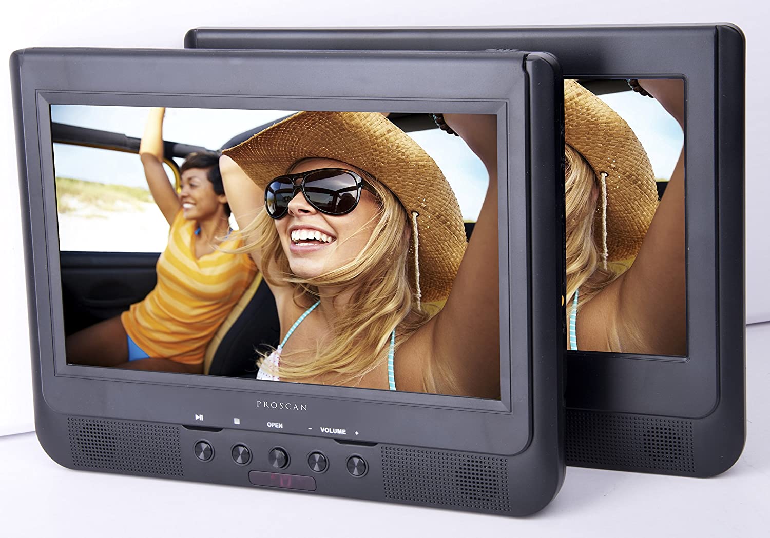 Introducing the latest in DVD Technology. This Proscan 10-Inch Dual DVD Player is a must for anyone traveling with a family! It includes 2 X 10-Inch Screens which can be connected to play the same DVD on both screens. Watch your favorite DVDs or any video or TV show via included USB, SD or MMC card. The large 10-inch screens make viewing from the back seats a pleasure. Easily mount the DVD Players to a car with the included car mounting kit. The DVD players have built in battery and can be powered or recharged from home or car with the included AC/DC adapter. Also included are 2 headphones, a 3.5 MM Audio/Video connection cable, remote control, and Dc connection cable. If you are looking for a top quality portable DVD player for home or car, look no further as this will provide years of viewing enjoyment.