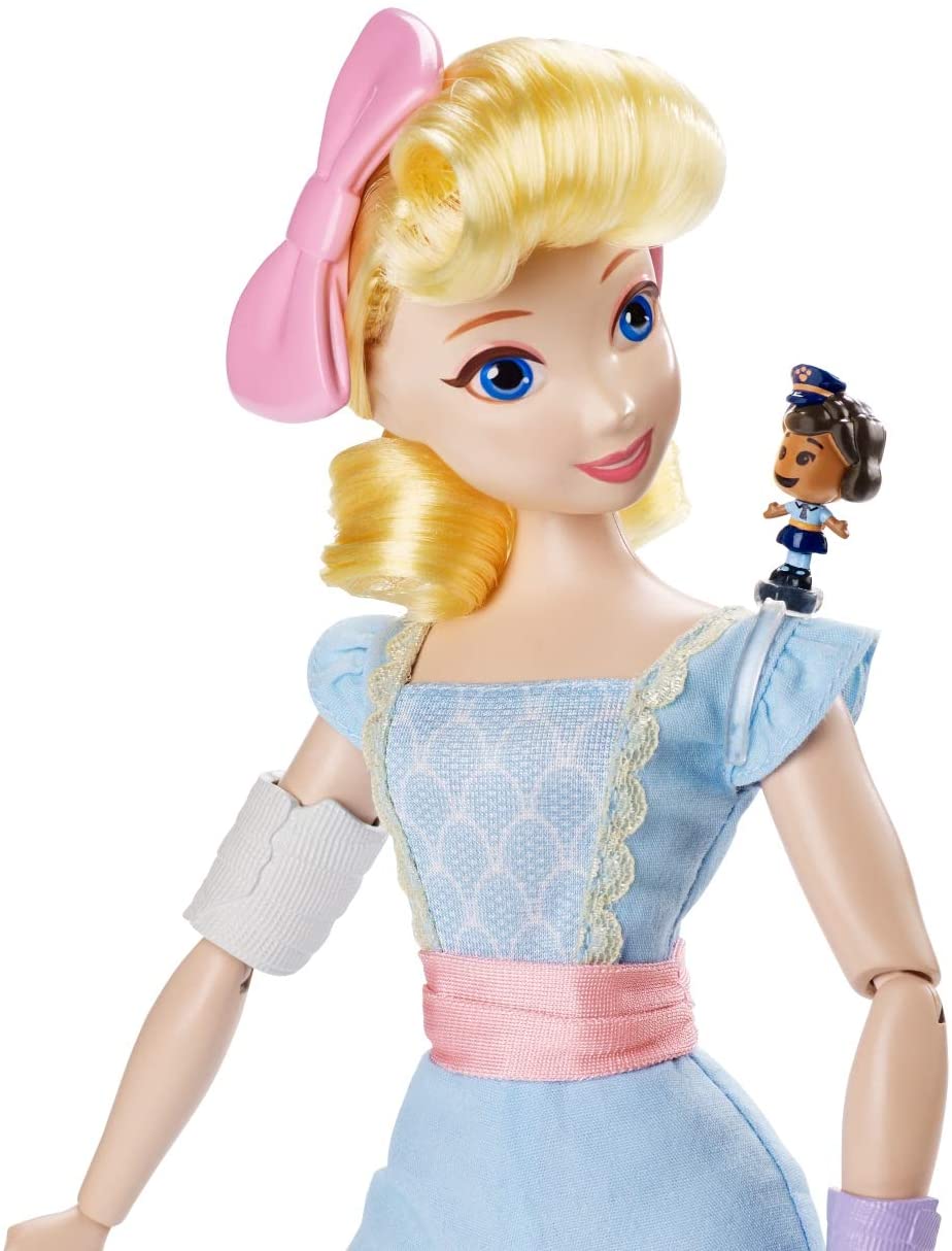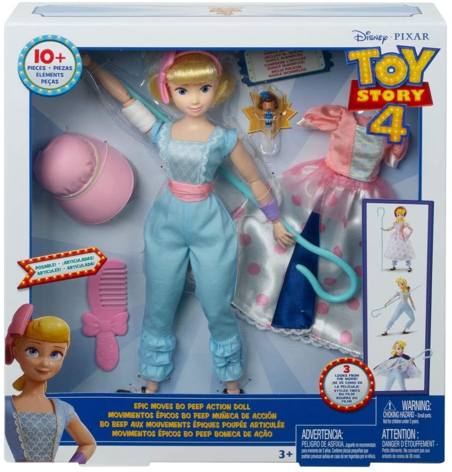 Fans get exciting action and fashion play with Disney/Pixar Toy Story 4 Epic Moves Bo Peep action doll! She's highly posable and comes with multiple costume pieces, accessories, her iconic staff and a comb for big action, hair and fashion play all in one toy! Bo Peep comes with three outfit looks from the movie and her trusty friend Officer Giggle McDimples (in tiny scale) who sits atop Bo's shoulder to protect and guide her on all the adventures that lie ahead. Kids will love the multiple ways to play with Epic Moves Bo Peep Doll and her friend Giggle McDimples! Colors and decorations may vary.