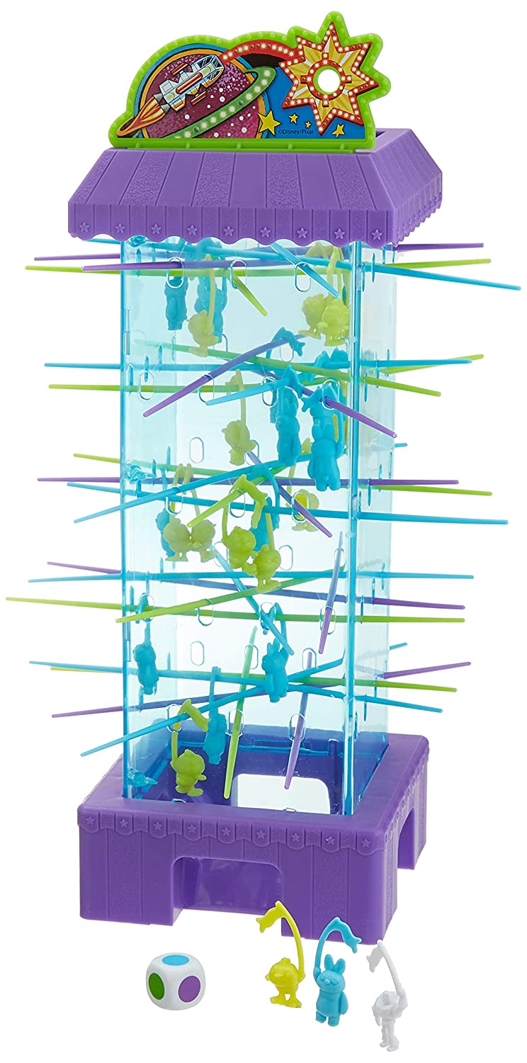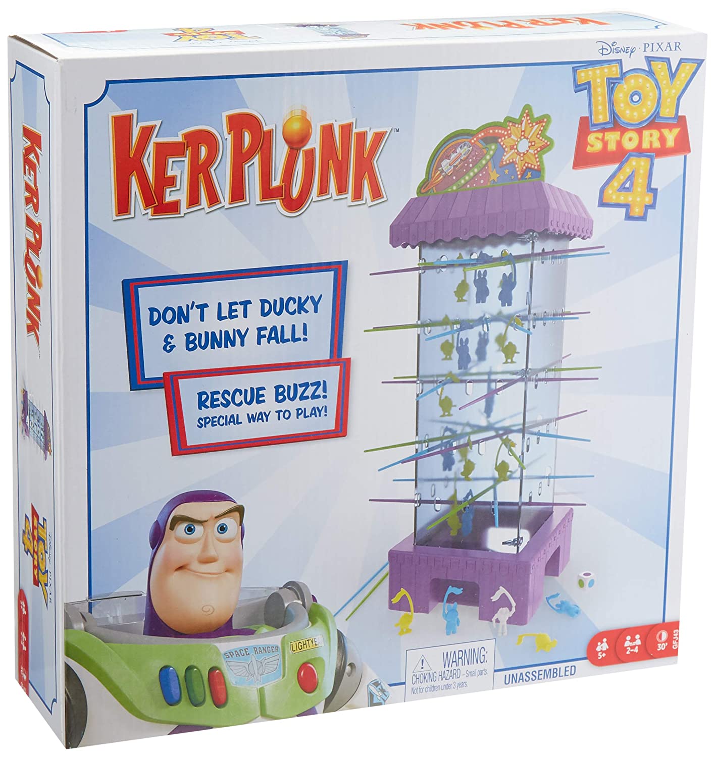Kerplunk! featuring Disney Pixar Toy Story 4 is the classic kids’ game you know, now with a fun theme that Toy Story fans will love! Featuring fan-favorite characters Ducky and Bunny along with a carnival-themed game unit, this easy-to-learn kids game is sure to be a hit. To play, create a lattice of sticks inside the translucent, carnival-themed tower. Then, drop the Ducky and Bunny character pieces inside where the web of sticks will hold them. Each player takes a turn rolling the die and pulling out a colorful stick -- whichever color the die indicates. Be careful not to let your favorite characters fall -- the player who drops the fewest Ducky and Bunny character pieces is the winner! When you’re ready to shake things up, grab the Buzz Lightyear character piece and try the super-fun special game mode. With easy instructions and no reading required, this game is great for kids and Toy Story 4 fans of any age. And since you create the lattice of sticks, no two games are alike! Includes 1 carnival game unit, 30 sticks, 1 die, 30 Ducky and Bunny character pieces and 1 Buzz Lightyear character piece. Colors and decorations may vary.