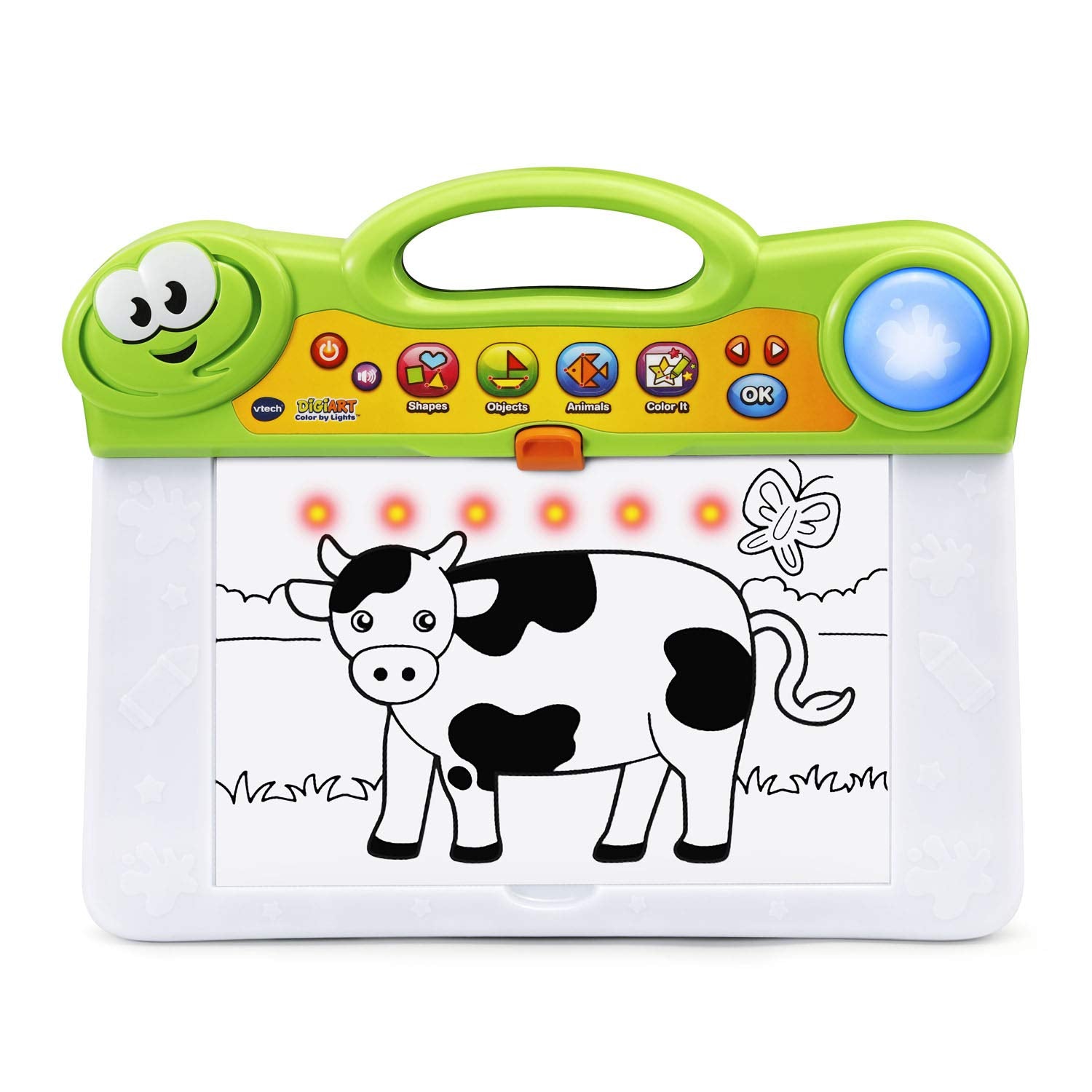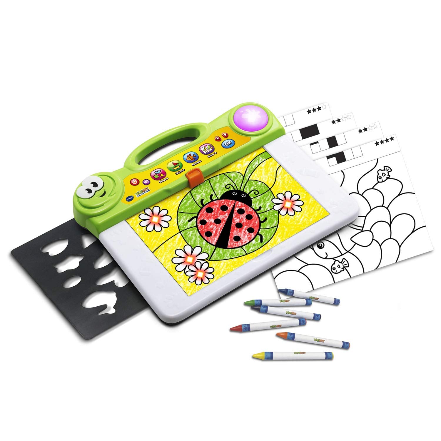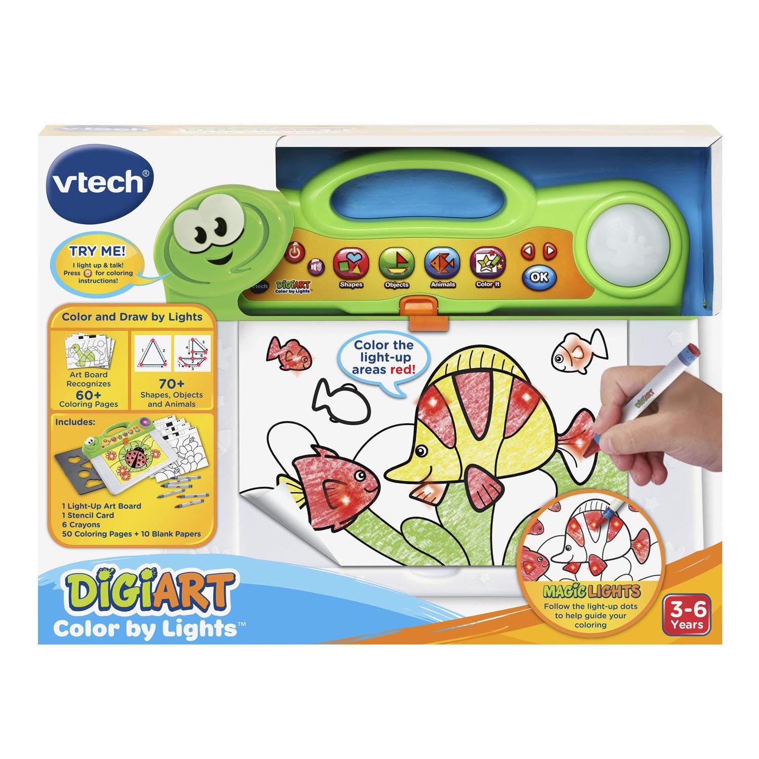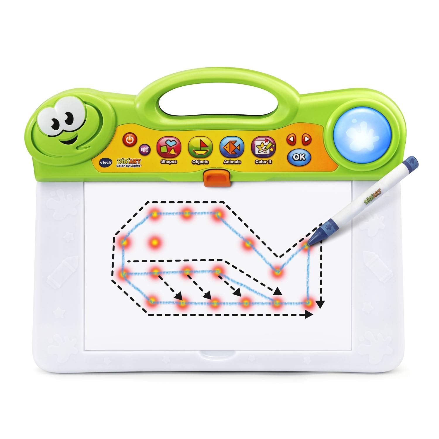 Let lights guide the way as you create your next masterpiece with digiart color by lights. The light-up board identifies each of the 50 included coloring pages and responds by showing what color to use in each section. Download more pages online for unlimited printing and play. Connect the light-up dots to draw shapes, objects and animals. The art board features a dry-erase surface and a stencil card for more creative play, plus a variety of melodies to enjoy while creating your work of art. Color and create with light!