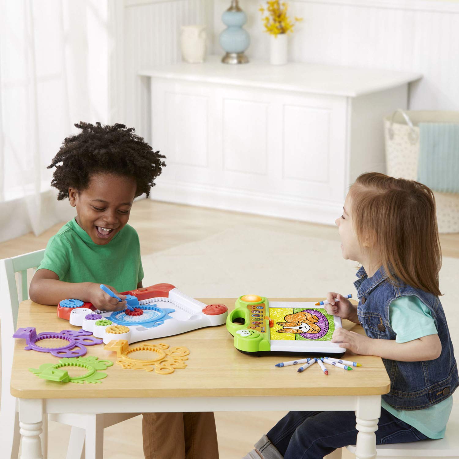 - stencil slides out from the back of the unit and can be used to draw a variety of shapes. This art board toy is intended for ages 3 to 6 years; 2 AA batteries are included for demo, use new batteries for regular use